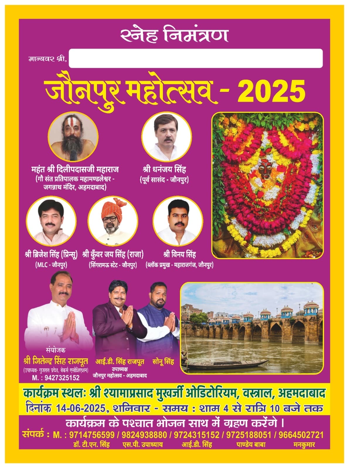 अहमदाबाद ! आई डी सिंह जौनपुर महोत्सव – 2025 का आयोजन 14 जून 2025, शनिवार को श्री श्यामाप्रसाद मुखर्जी ऑडिटोरियम,…