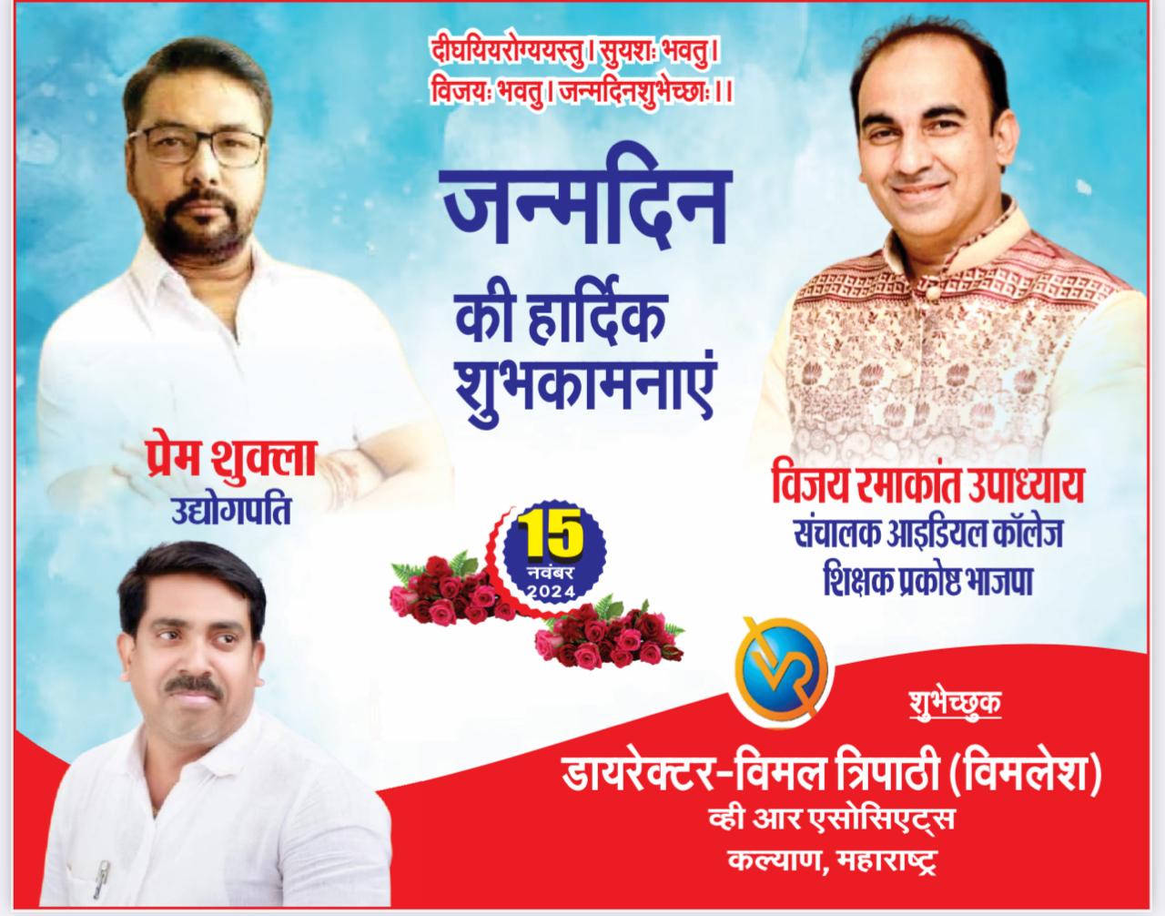 जन्मदिन विशेष 15 नवंबर 2024 को, वी आर असोसिएट कल्याण के डायरेक्टर विमल त्रिपाठी (विमलेश) ने उद्योगपति प्रेम शुक्ला और…